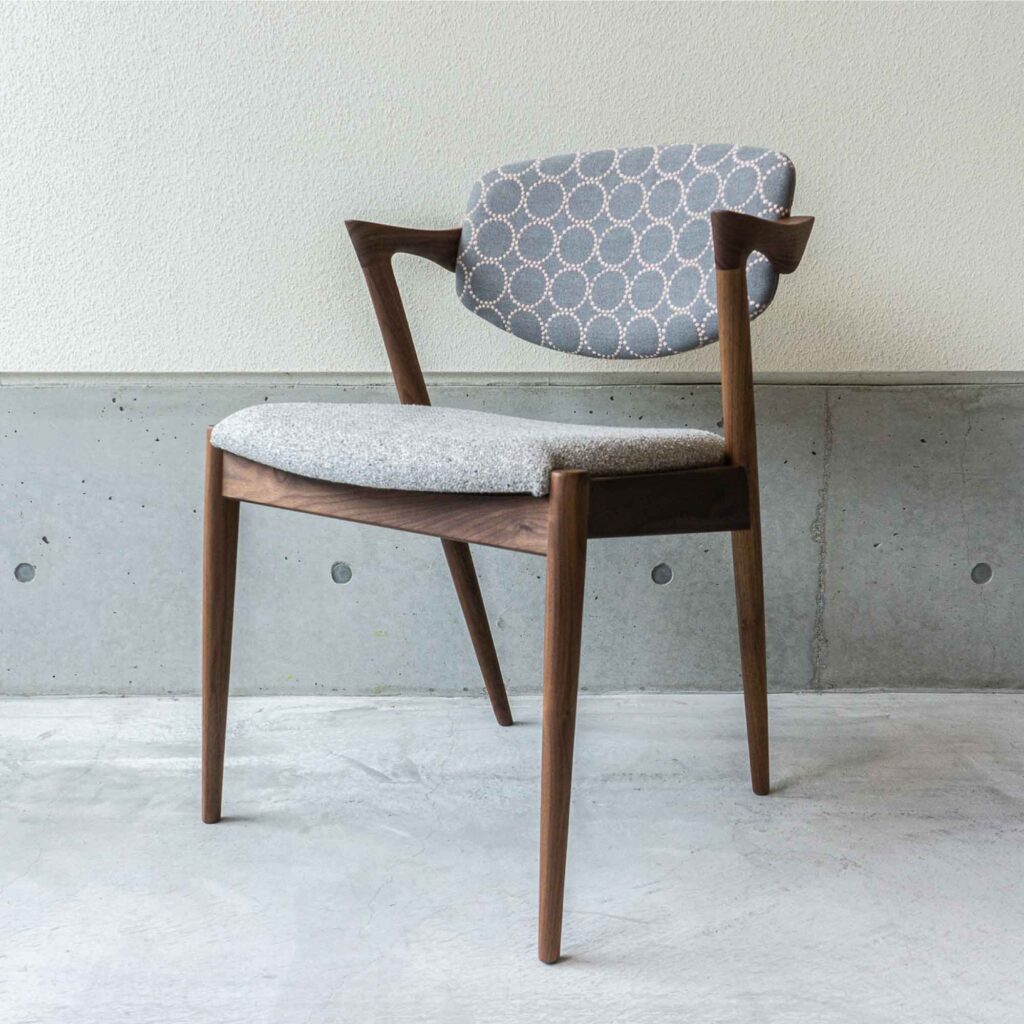 こちらもカイ・クリスチャンセン氏デザインの名作チェア。腕の収まりが良い絶妙な大きさのハーフアームが備わり、長時間座っていても疲れにくい構造です。造りの難しさのためか製造中止となっていましたが、復刻製作が実現しました。さすが名作の名に違わず、どこから見ても美しいです。名作椅子と言われる所以はデザインだけでなく、この計算された座り心地の良さがあってこそだと思います。