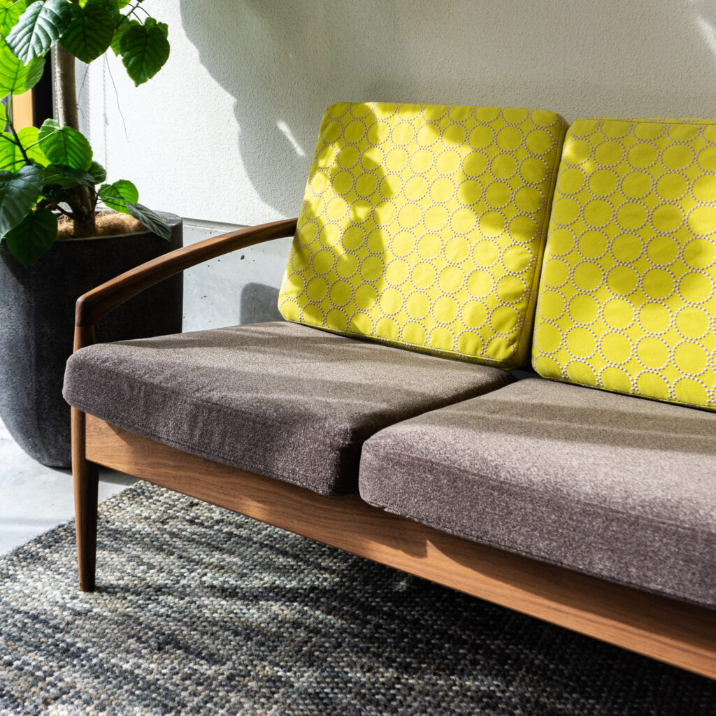 カイ・クリスチャンセン氏デザインの名作”ペーパーナイフソファ”。背もたれをtambourineの2色からお選び頂き、座面は宮崎椅子製作所の張地からお選びください。
