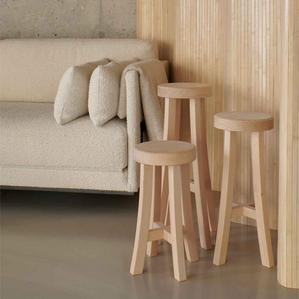 岡山県の山間の納屋で作られたことから名付けられたナヤスツールは、もともと作業用のスツールとして作られました。20年以上納屋に眠っていたスツールを、サイズ展開を増やし復刻しました。座面が平でサイズもコンパクトなので、高さがあるものはキッチンスツールに、低いタイプはスツールの他、サイドテーブルとしてソファ脇やベッドサイドで重宝します。