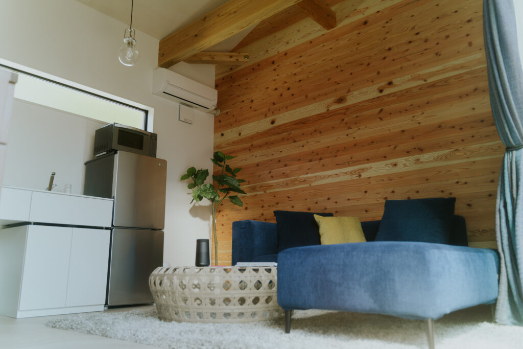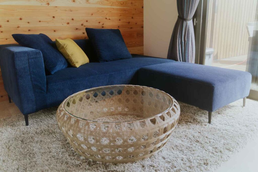 コテージの玄関をくぐると、お風呂やトイレ、キッチンなど水回りの設備とリビングスペースがまとまっており、一見リゾートホテルに来たかのような便利さです。天井高が高く開放感のあるリビングは、ウッドデッキへつながる窓を開放することで、更に開放感が出てリゾートを満喫することができます。