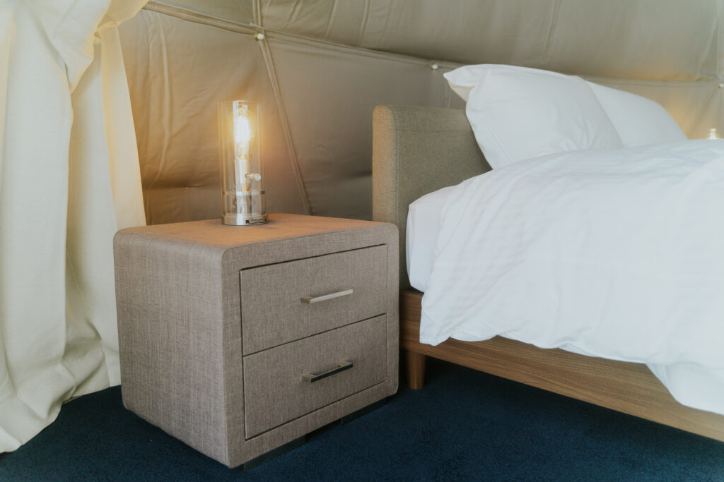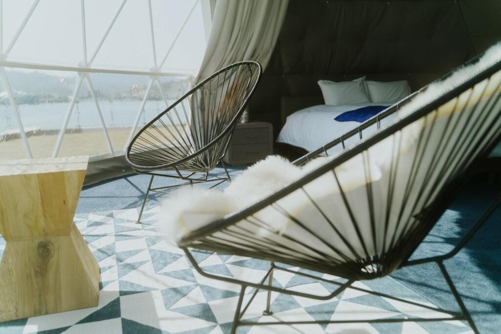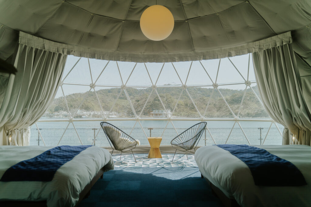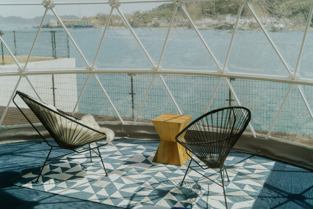 いよいよお待ちかねのドームへと。目の前の海を独占した贅沢な空間で、このテントの中で過ごした時間は一生の思い出になること間違いなしです。空調もしっかりとしており、夏の暑さや冬の寒さとも無縁です。また、テントの前はすぐ海なので、人の目も気になりません。