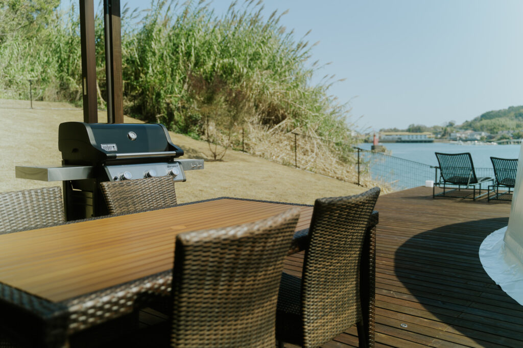 ウッドデッキに置くダイニングテーブルには、樹脂製のダイニングテーブルとチェアを合わせました。無垢材に見える天板は人工木材で、面倒なメンテナンスも不要です。編み込み部分と、無垢材に見える天板の素材感の違いが空間にリズムを付けますね。