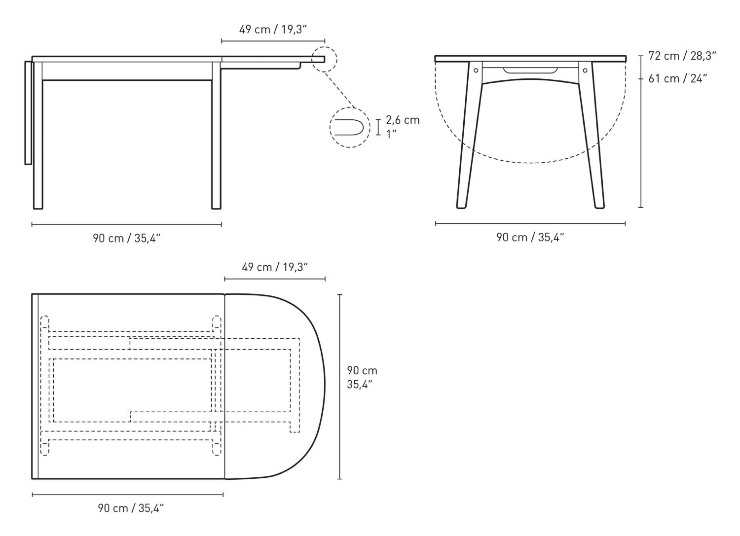 | サイズ | W90 / 1390 / 1880 ×D90×H72㎝(脚間 W80×D46㎝) |