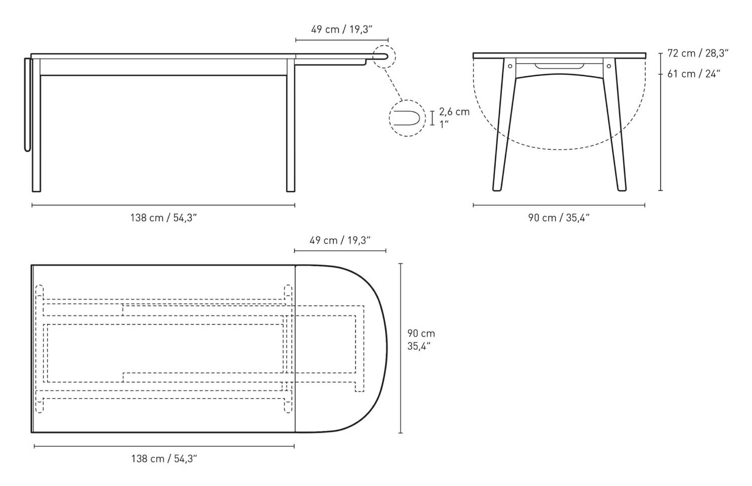 天板のサイズは138cm×90cm。幅49cmの伸長板を両サイドに使えば236cmまで伸長が可能なので、お客様を迎える時も安心です。