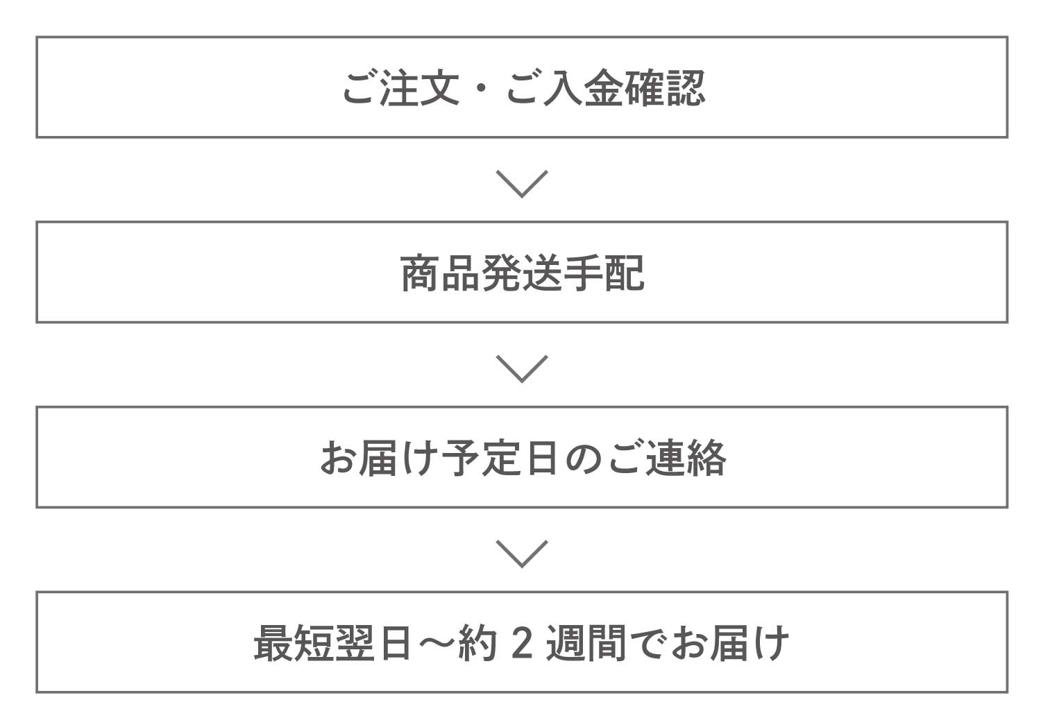 - ご希望のお届け時期まで余裕のない場合は、事前にご希望のお届け時期を明記のうえ、商品ページより納期確認手続きを行っていただくか、お電話にてお問い合わせください。