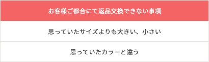 お客様のご都合による返品交換は、一切受け付けておりませんので、予めご了承ください。
